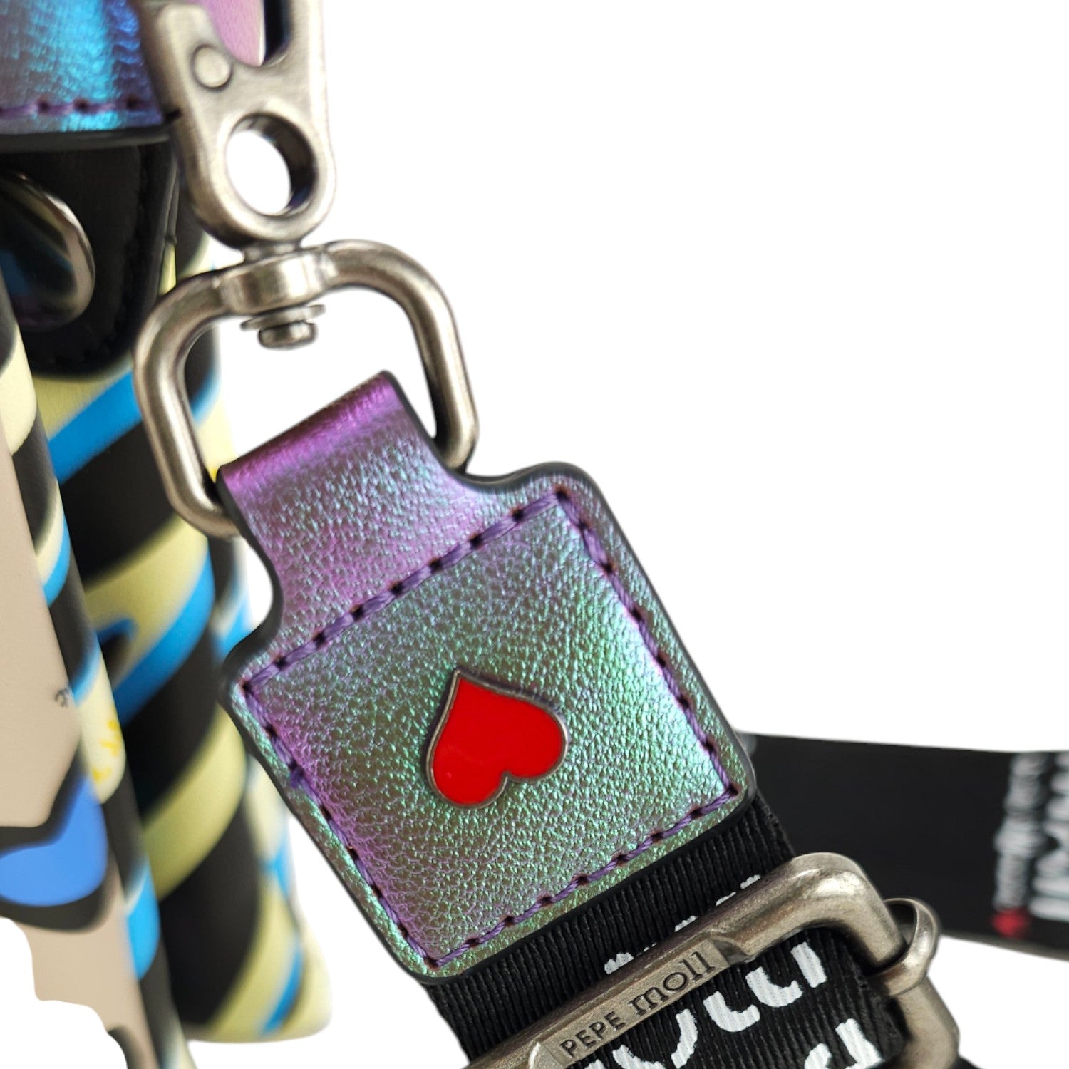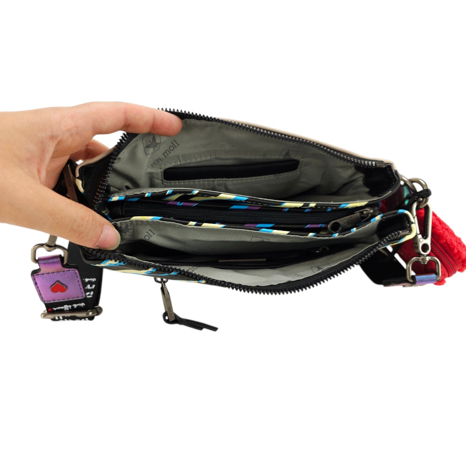 Original Bandolera Pepemoll Melodie, con compartimento principal con cierre de cremallera, cinta regulable a la altura deseada. Estampado en animal print combinado con apliques y colores que le dan un estilo rompedor.