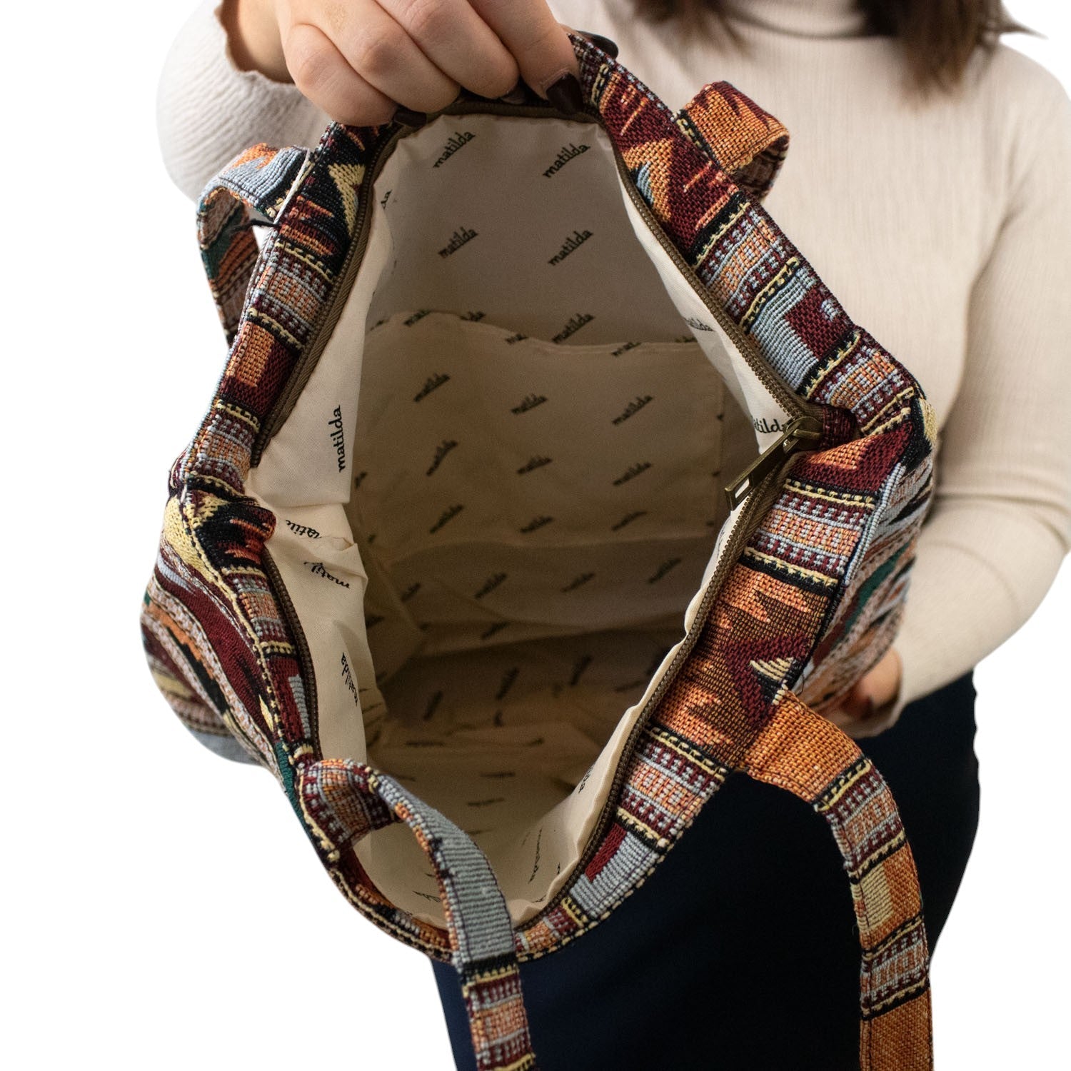 Bolsa estilo tote bag en estampado Cenefas de tamaño perfecto para todos los días, asas largas para llevar al hombro y cierre de cremallera, forrada en su interior