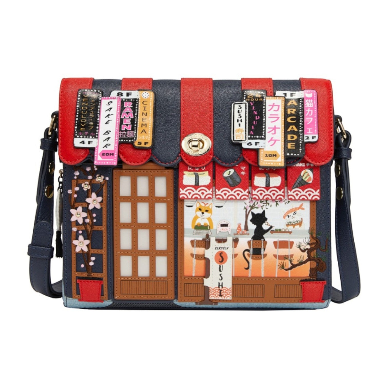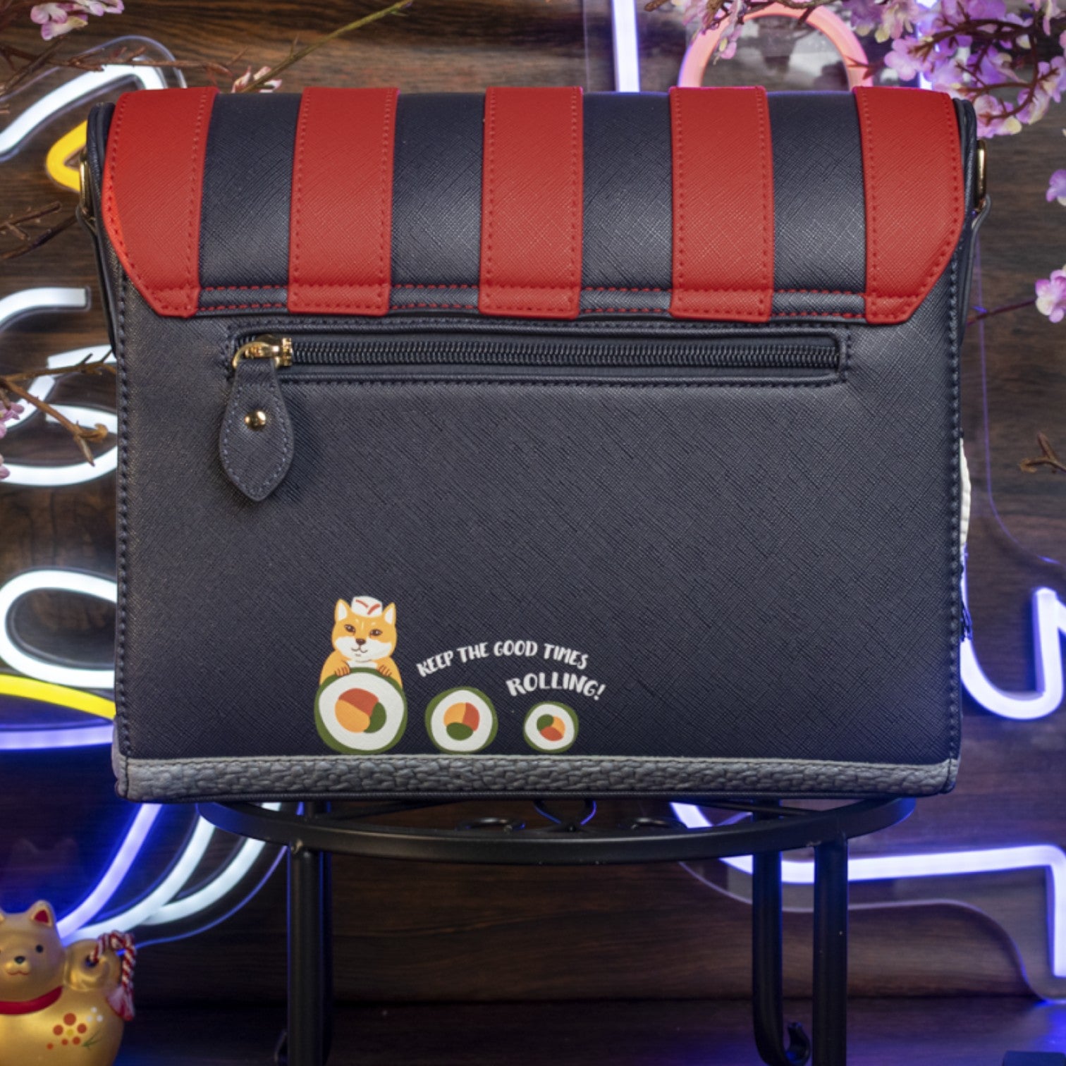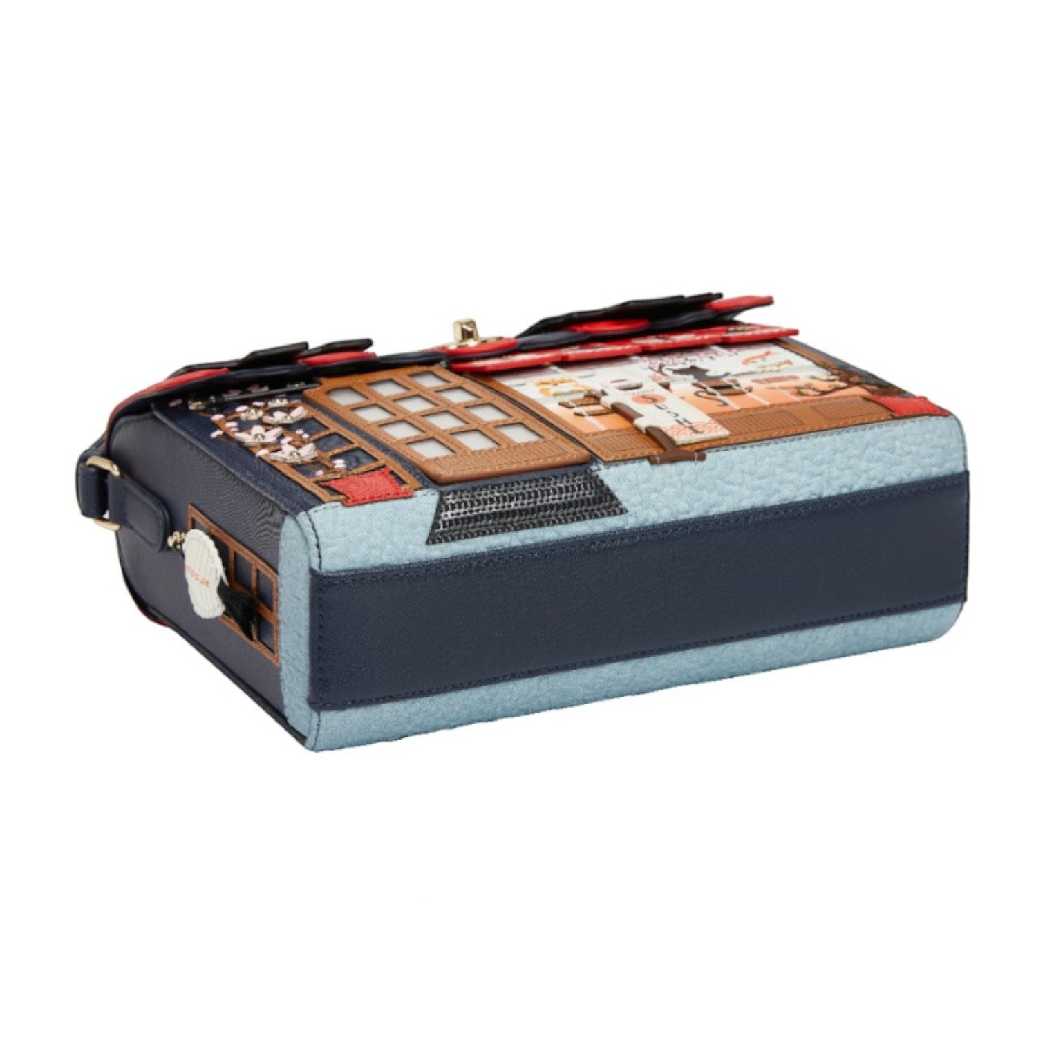 Este bolso es ideal para los amantes de la cultura japonesa, confeccionado en cuero vegano y de tamaño medio con cierre de solapa y cremallera, con cinta ajustable regulable. Tiene un compartimento amplio. Está repleto de detalles combinando tonos azules oscuros y naranjas ¡Precioso!