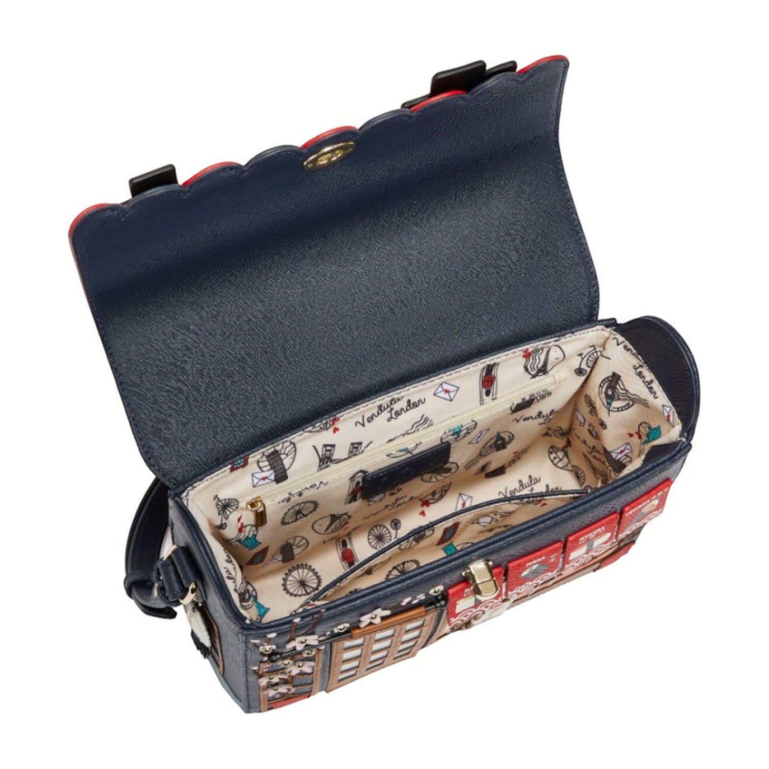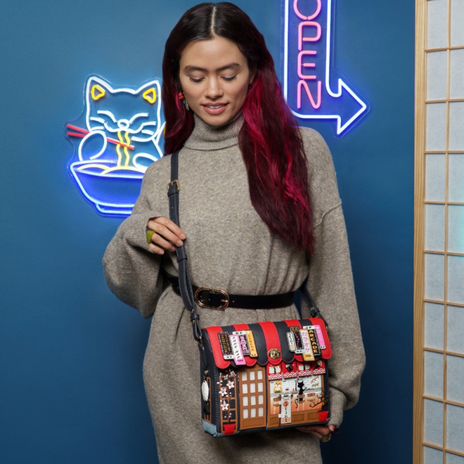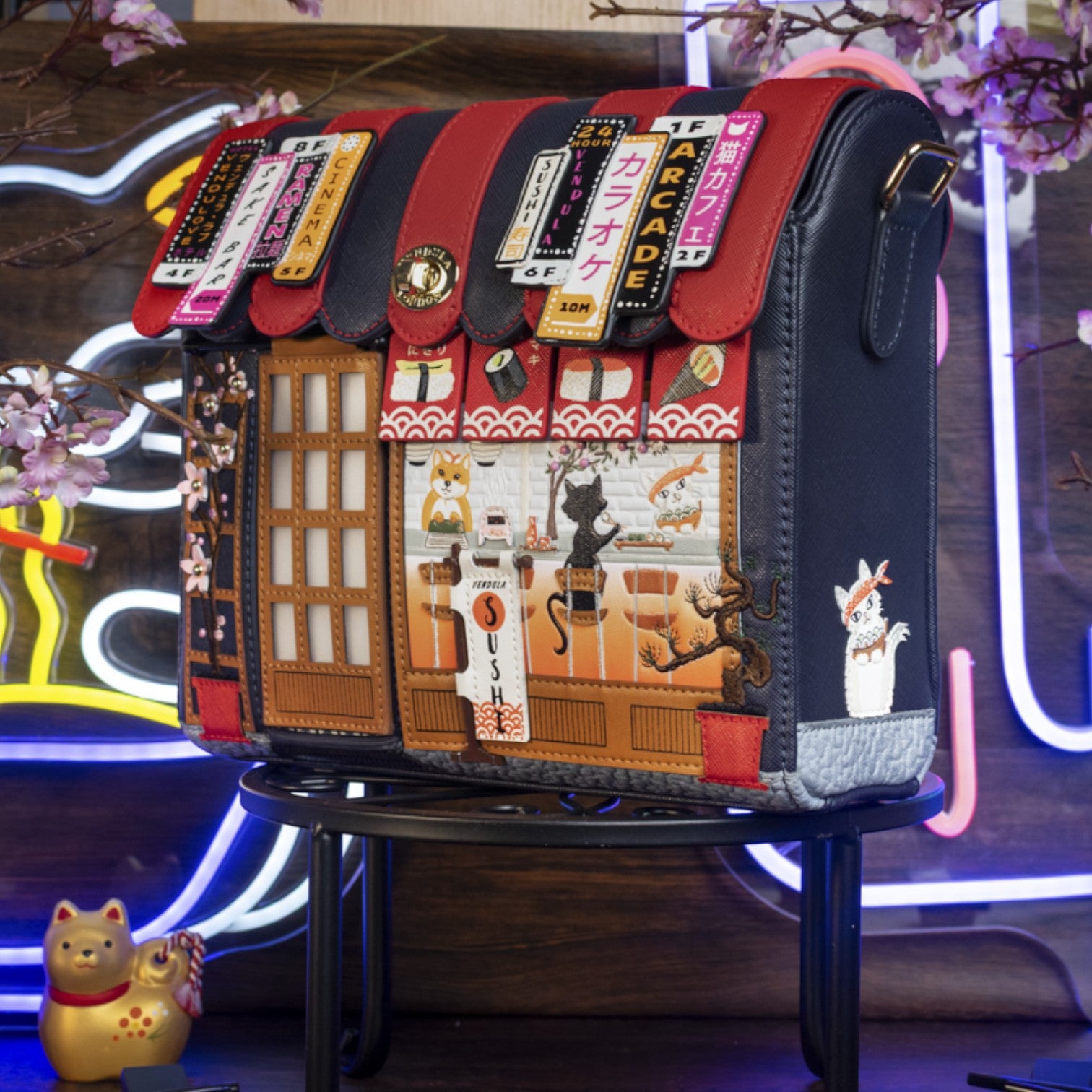 Este bolso es ideal para los amantes de la cultura japonesa, confeccionado en cuero vegano y de tamaño medio con cierre de solapa y cremallera, con cinta ajustable regulable. Tiene un compartimento amplio. Está repleto de detalles combinando tonos azules oscuros y naranjas ¡Precioso!