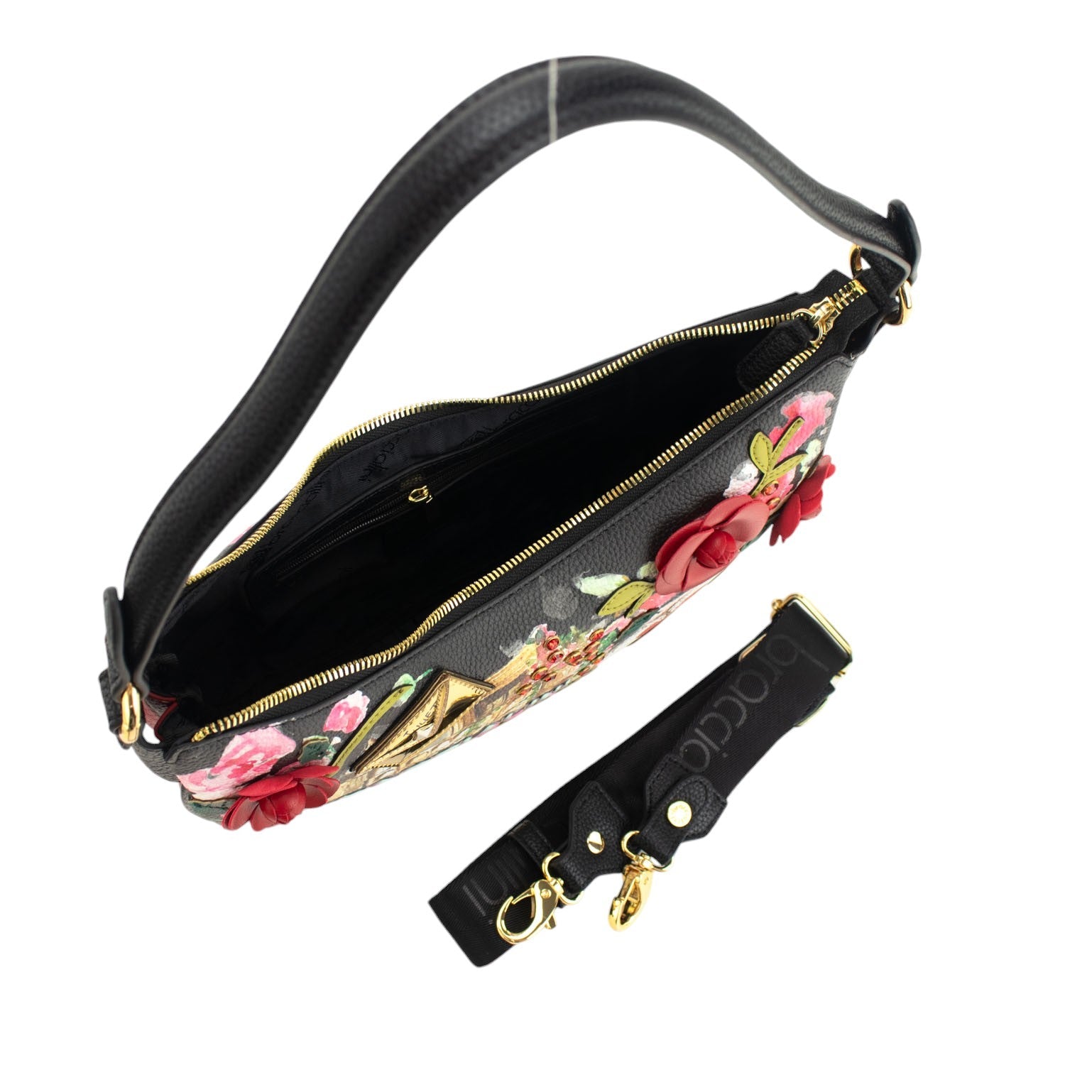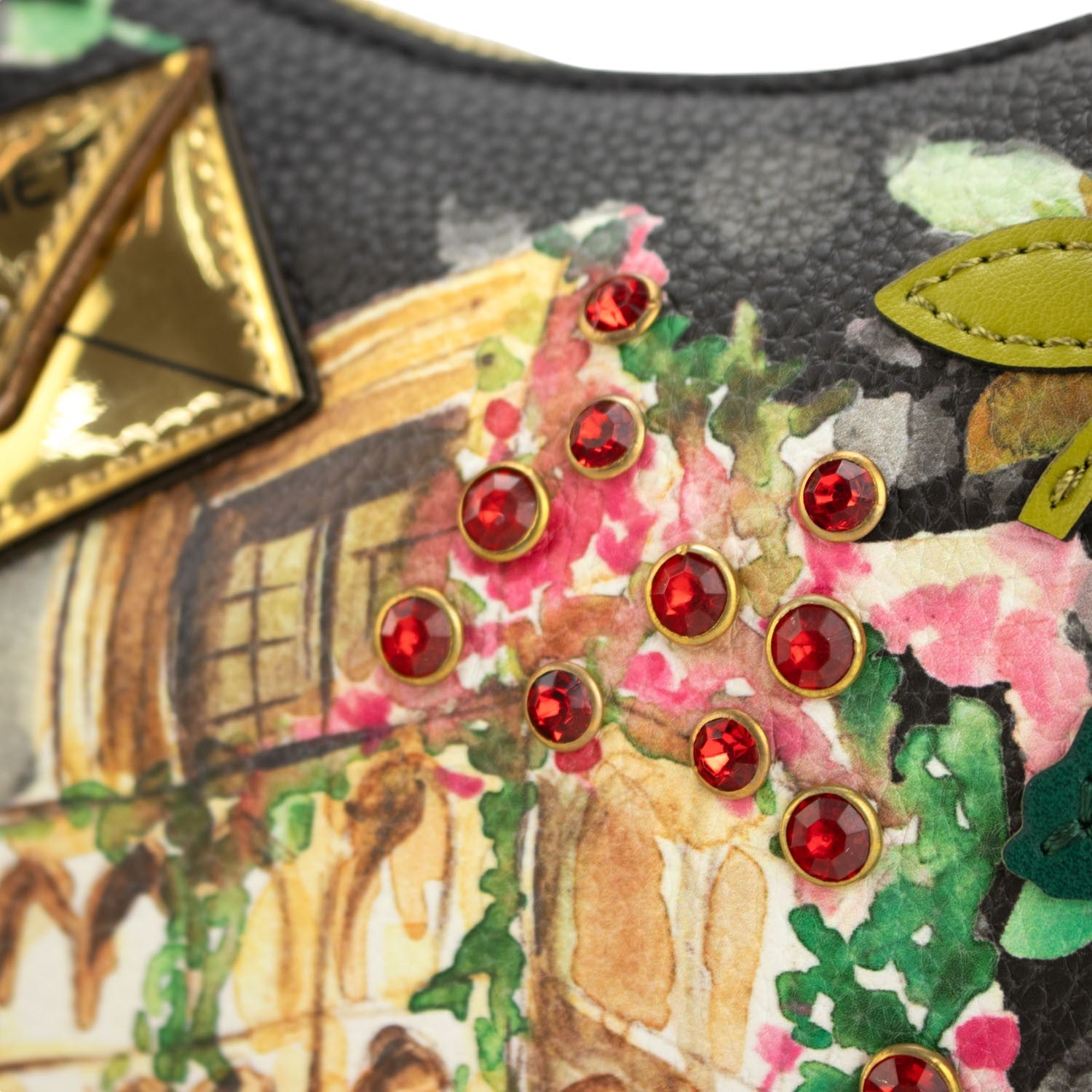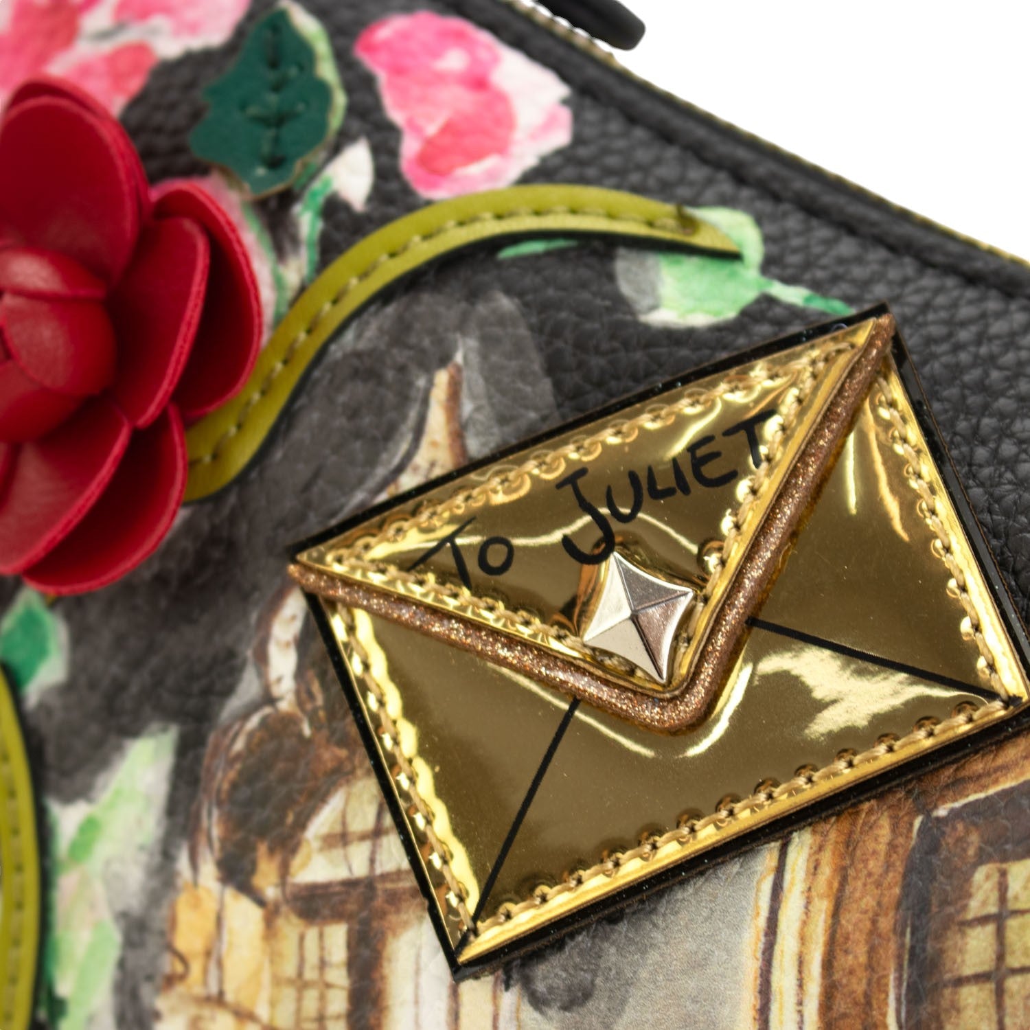 Un bolso de mano con asa de mano y un compartimento interior amplio, con cierre de cremallera. Su exterior es un espectáculo de color que detalla los elementos característicos de la ciudad de Verona con apliques y brillantes que realzan el diseño al máximo nivel ¡Te enamorará nada más verlo!