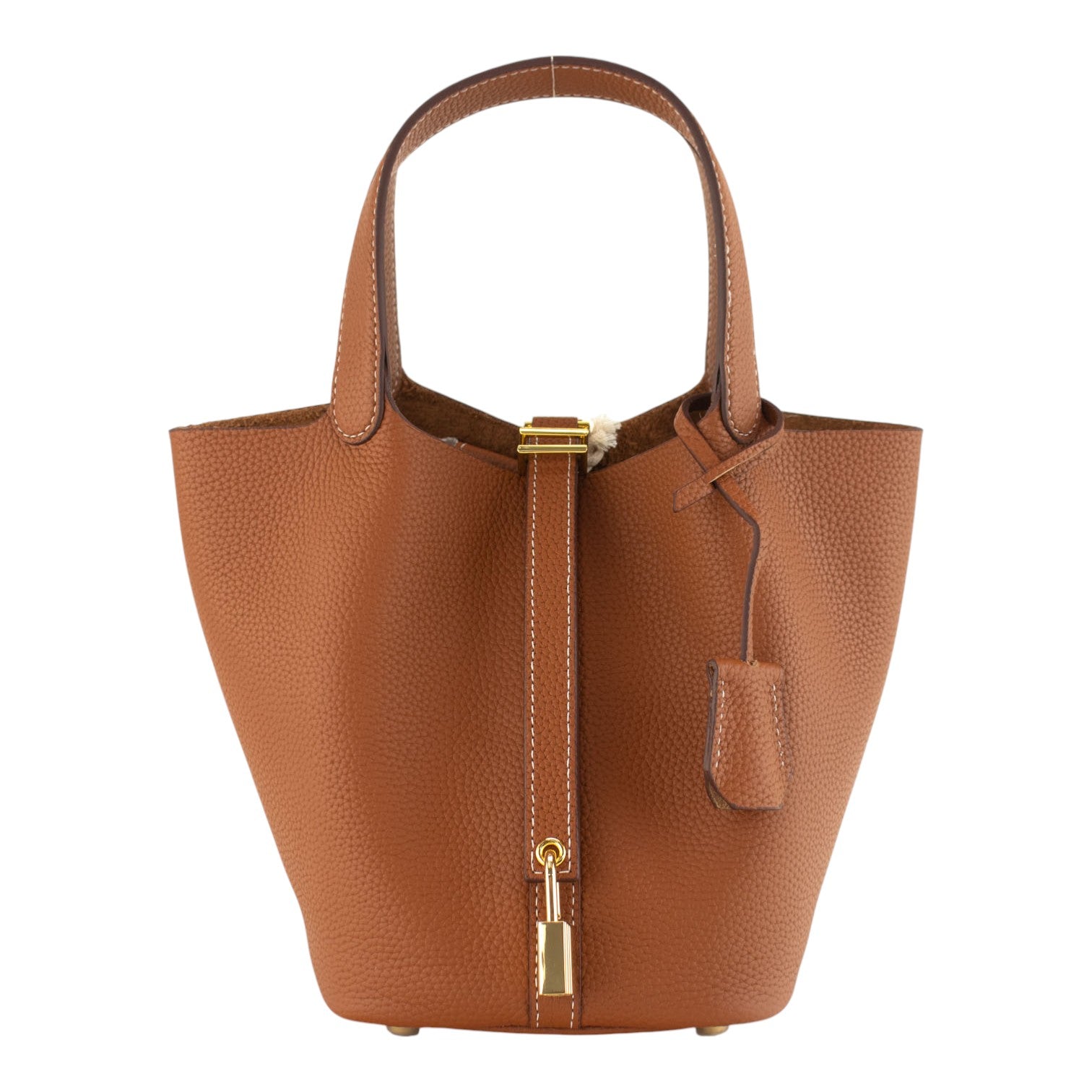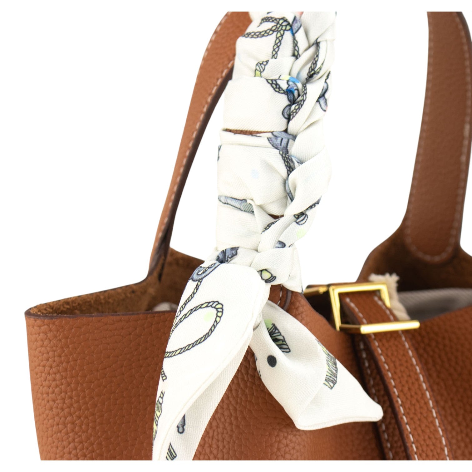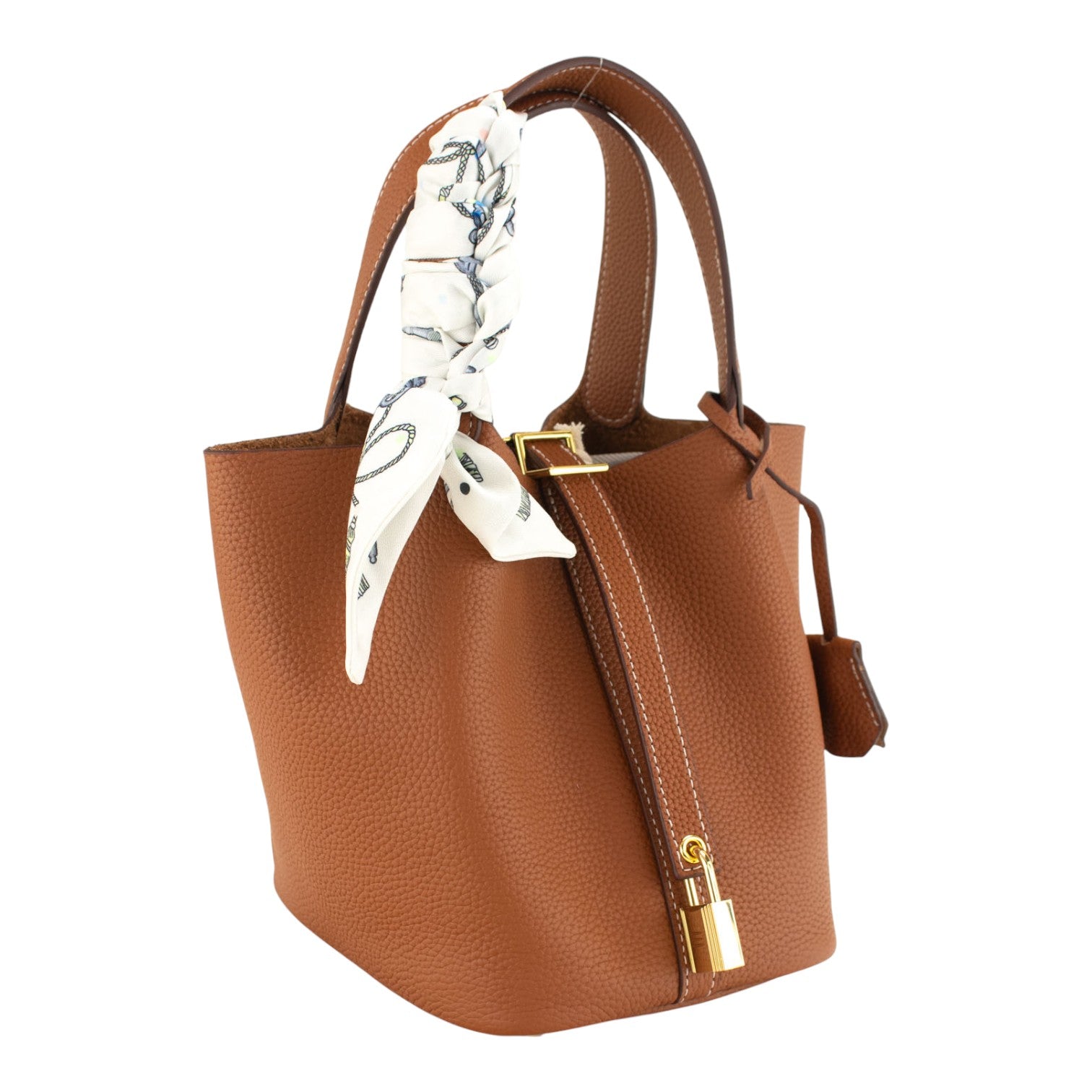 Su tamaño pequeño pero espacioso es ideal para el día a día, permitiéndote llevar lo esencial de forma organizada y cómoda. Tiene doble asa de mano y un original cierre con tira y candado. Pañuelo de la imagen incluido