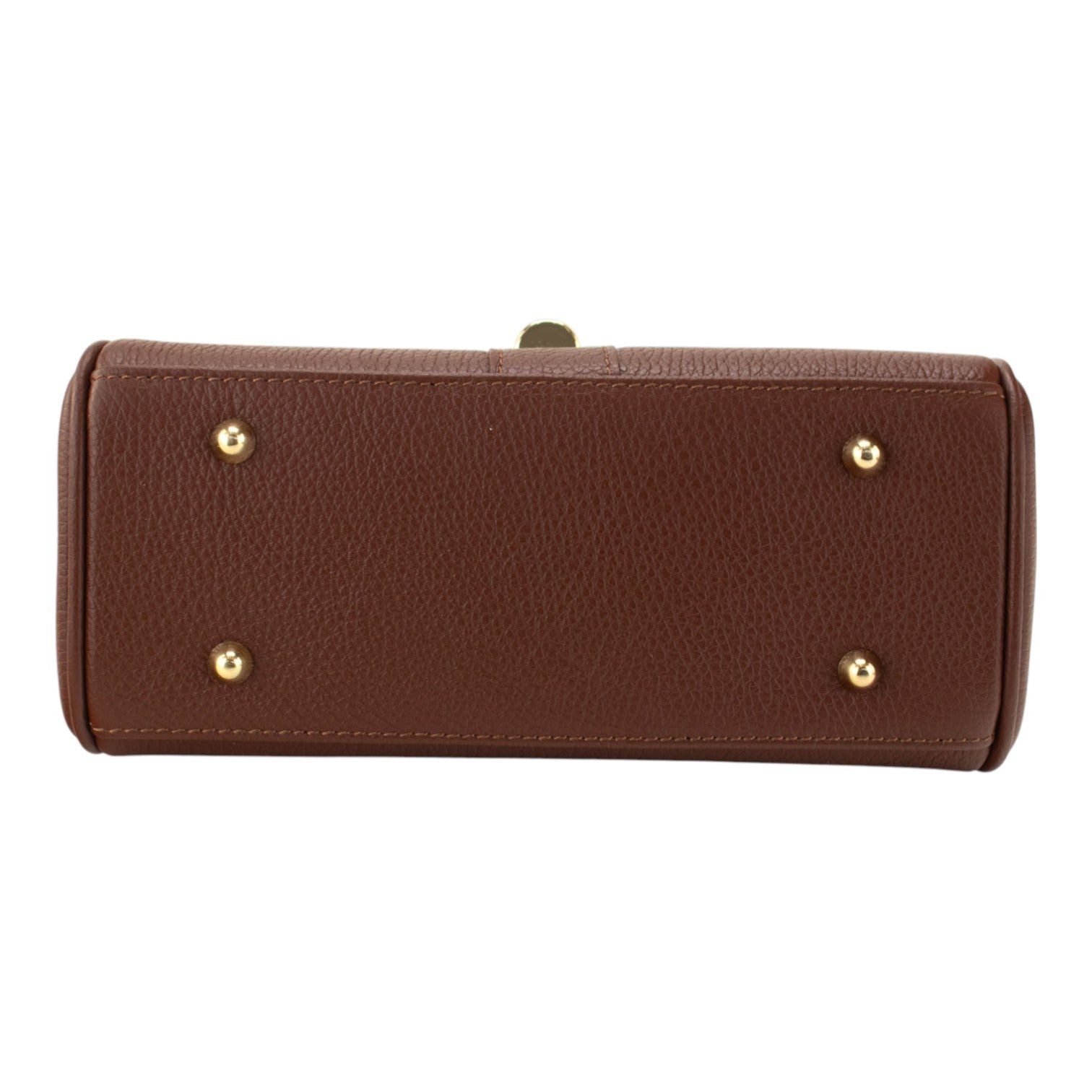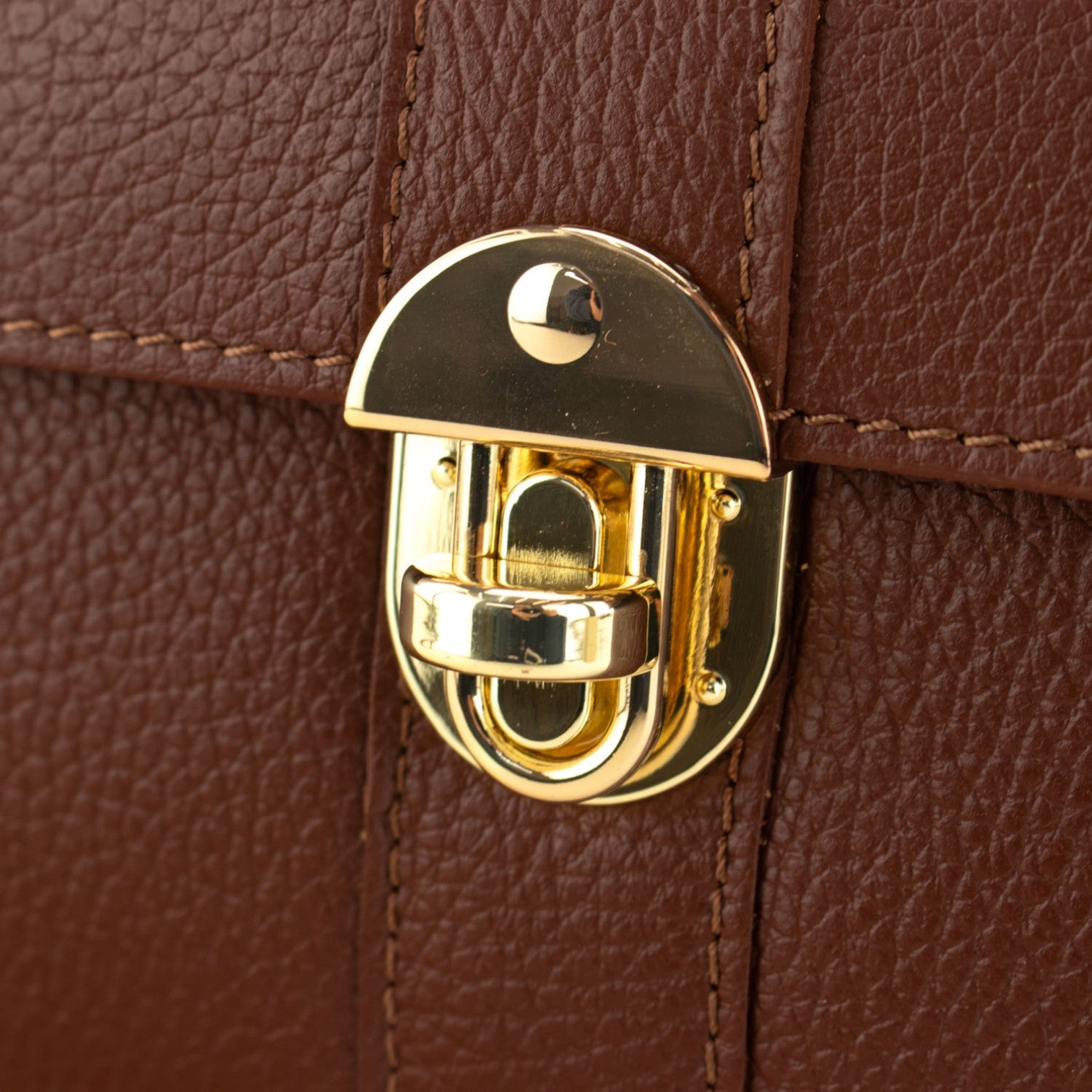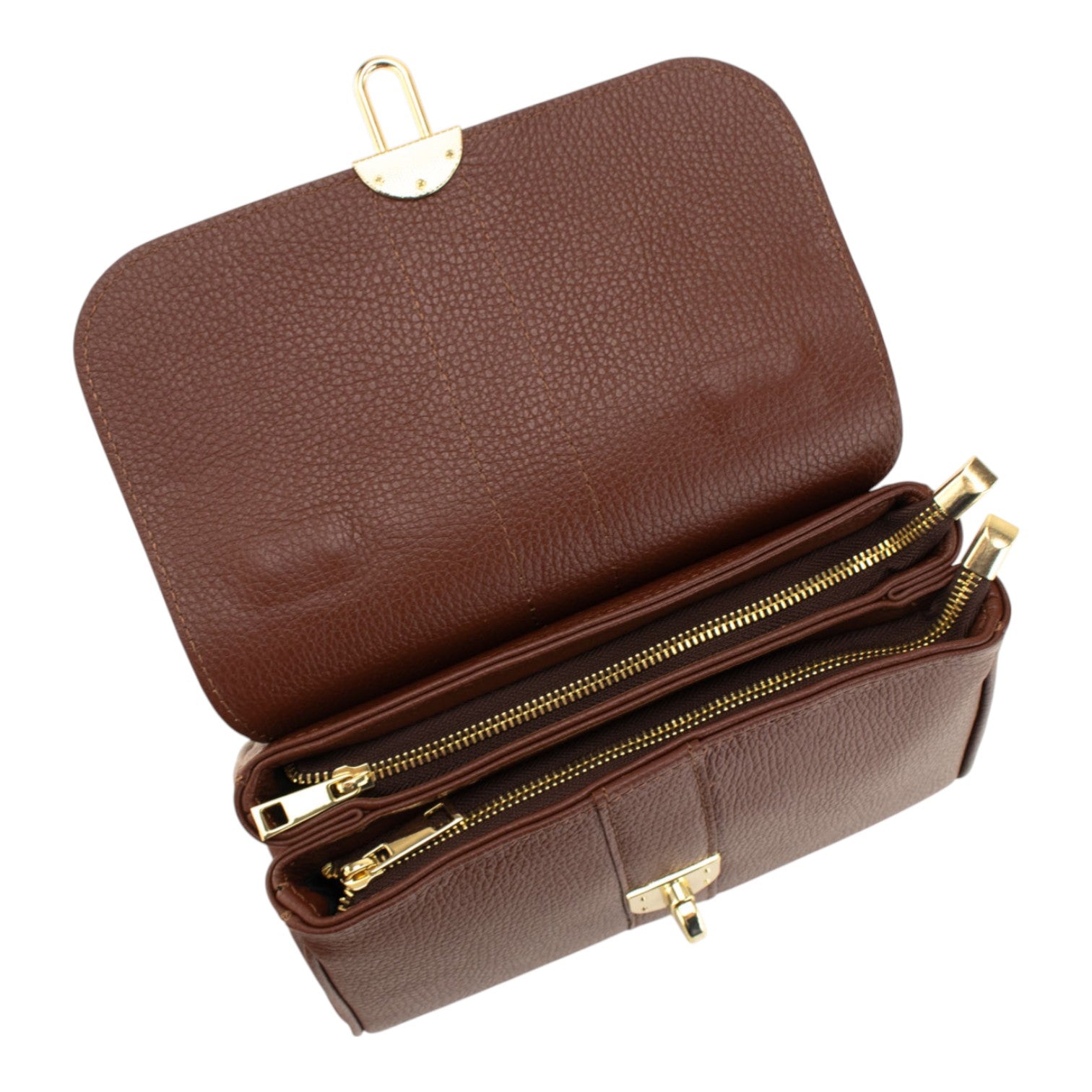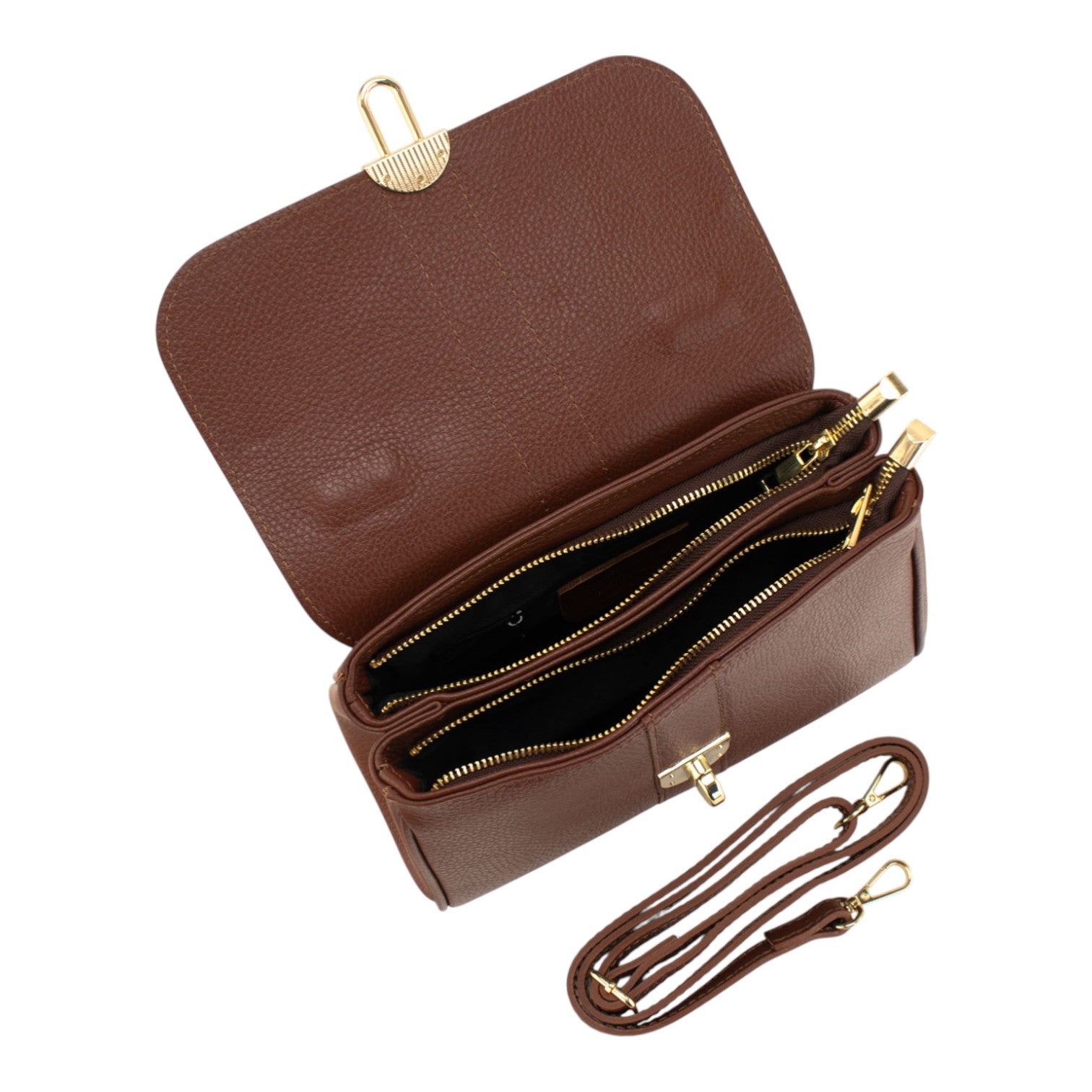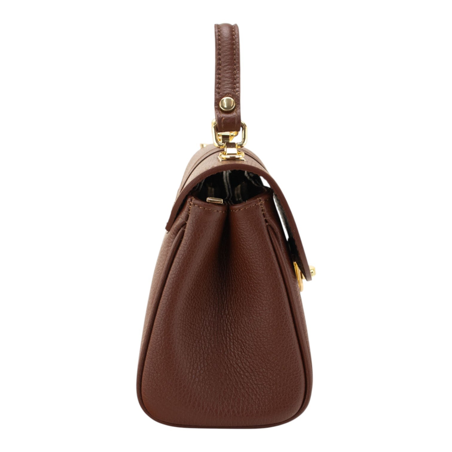 Un bolso muy original para lucir a diario, realizado en Piel 100% genuina vacuno italiana, este bolso está hecho en Italia con una excelente manufactura y calidad, tiene un cierre de solapa broche metalizado en tono dorado muy original, con doble compartimento interior amplio con cierre de cremallera. Dispone de asa mano y cinta de bandolera ajustable.