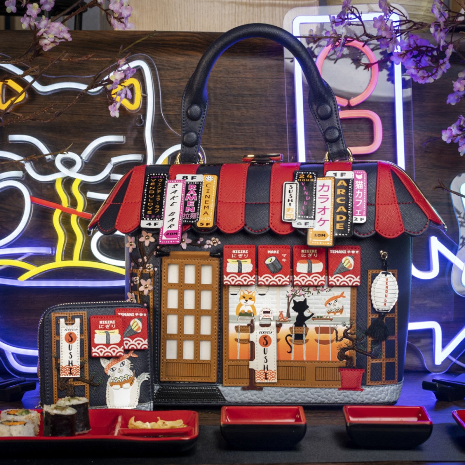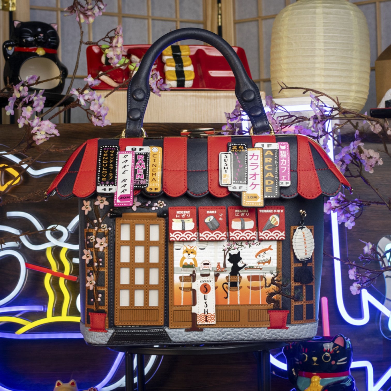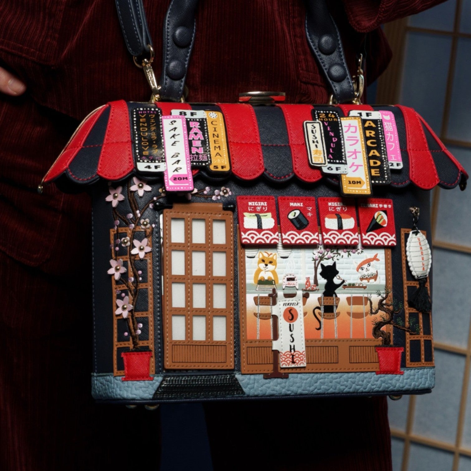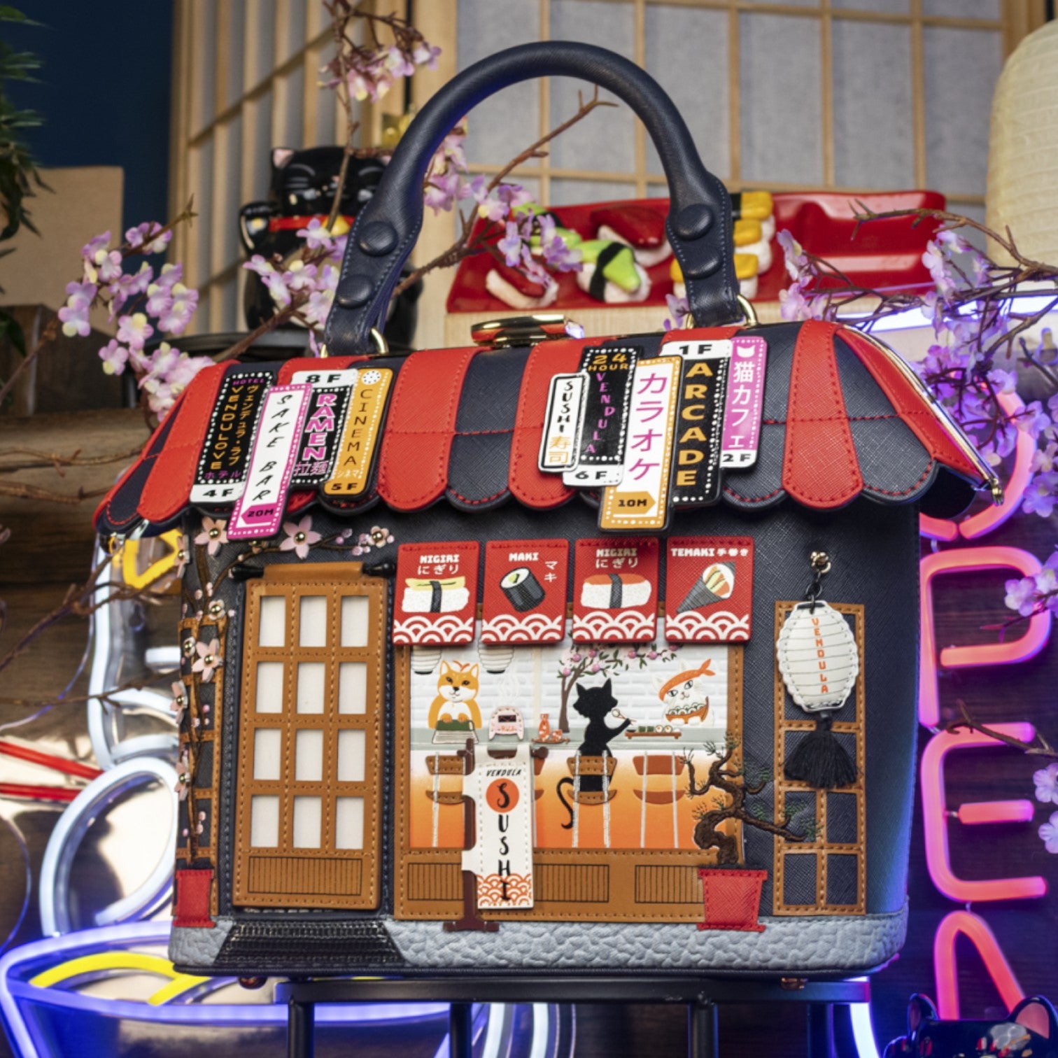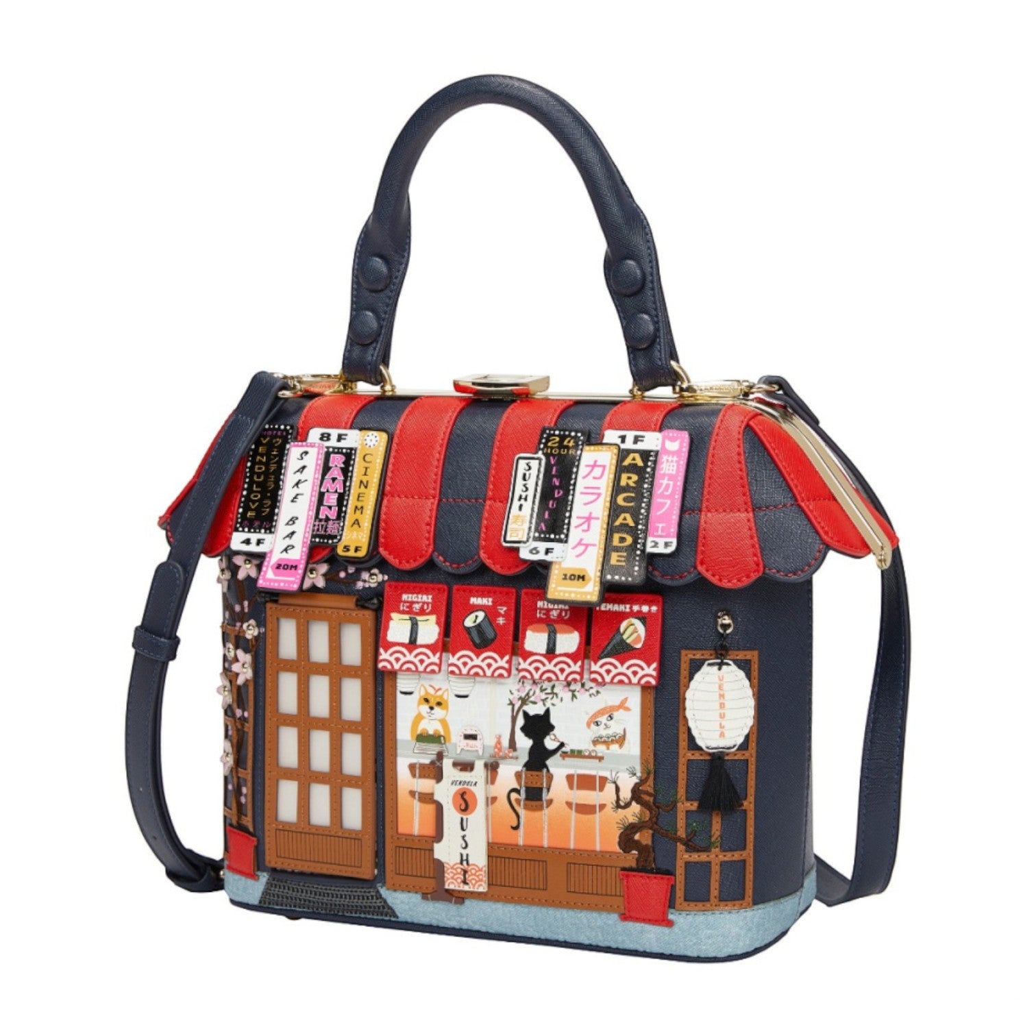 Un bolso que te enamorará nada más tenerlo, está repleto de detalles combinando tonos azul oscuro y naranja, es el bolso perfecto para los amantes de la cultura japonesa, viene con detalles en relieve y bordados que lo hacen único, tiene apertura con cierre semi rígido con broche y cremallera, además de cinta regulable.