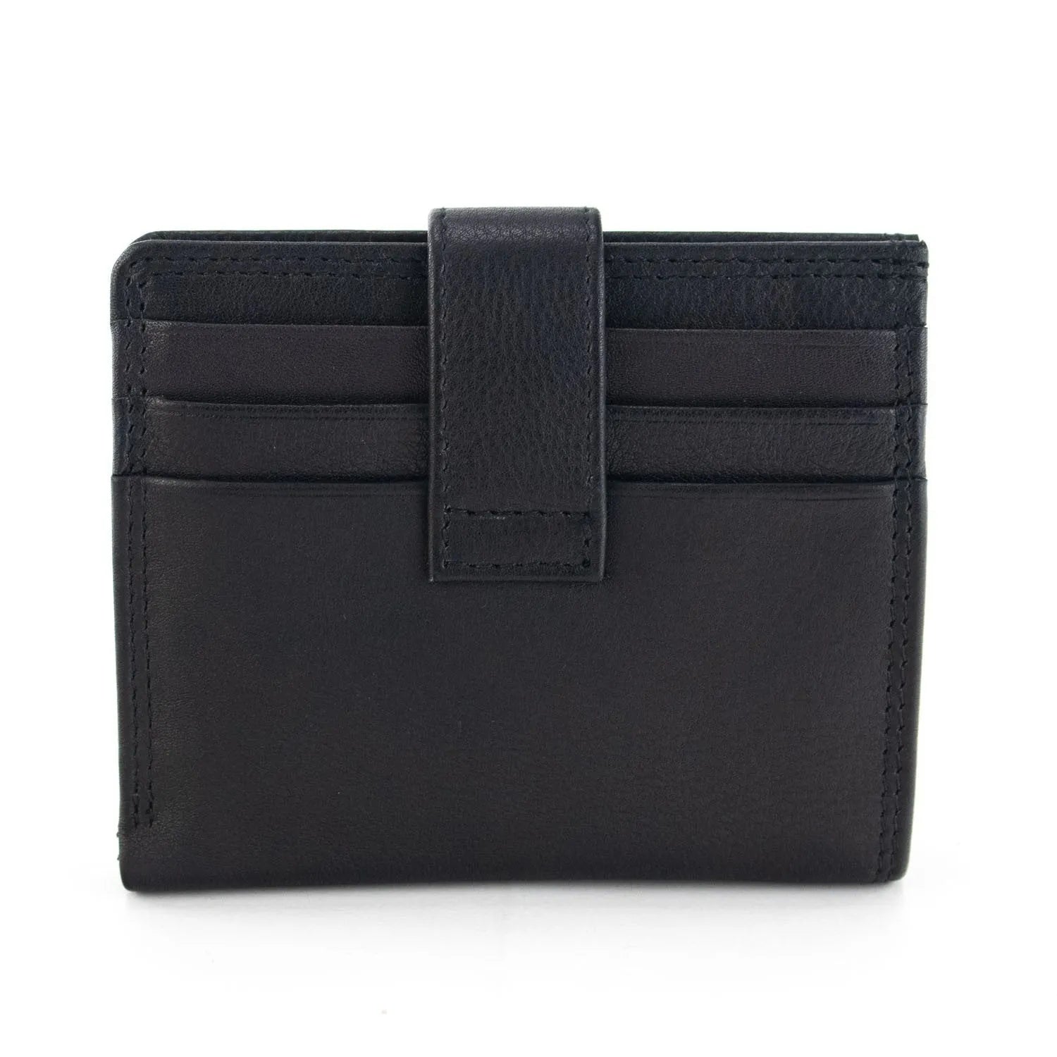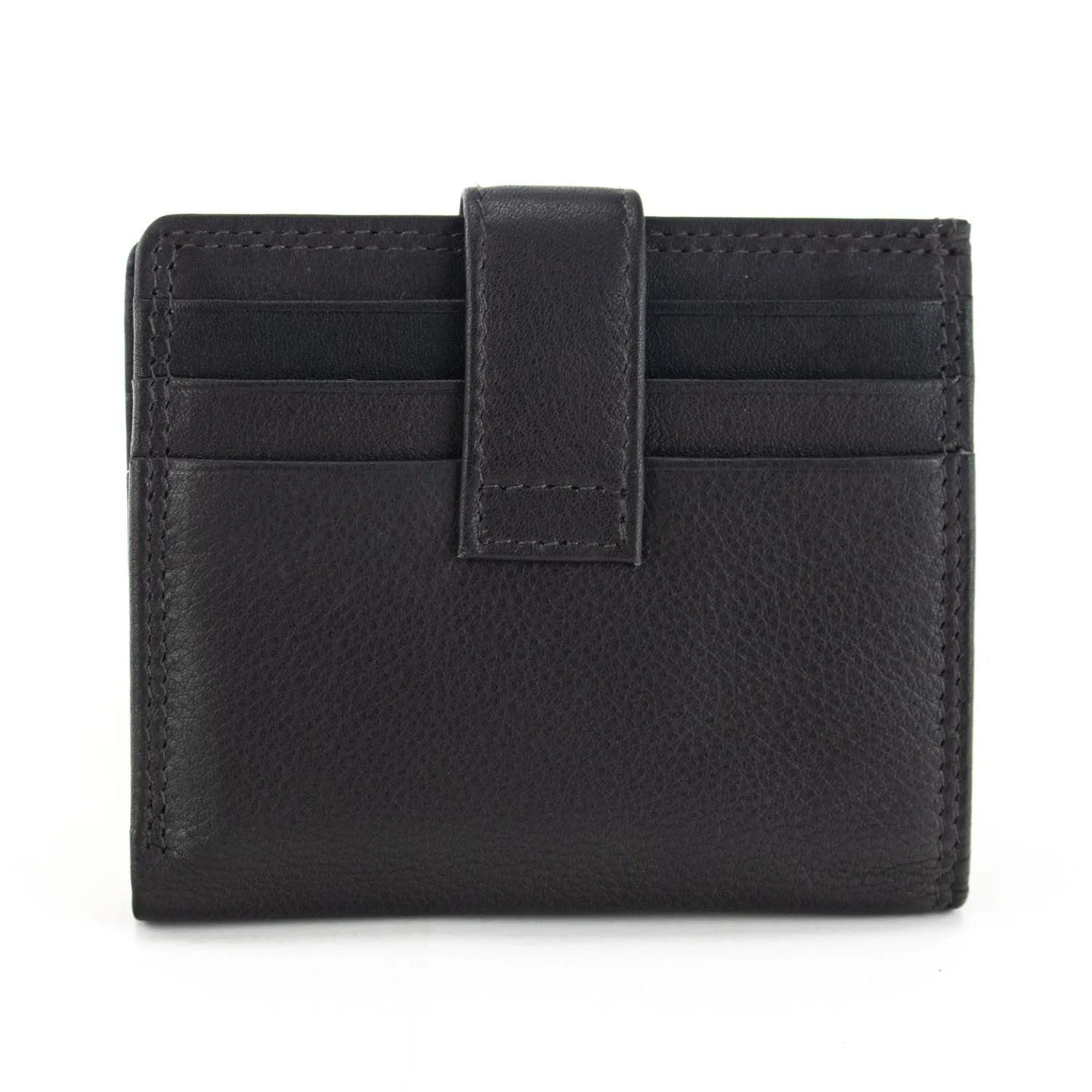 Un tarjetero super completo con cierre de broche y espacio para múltiples tarjetas. Acabado en tonos lisos en piel 100% vacuno